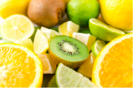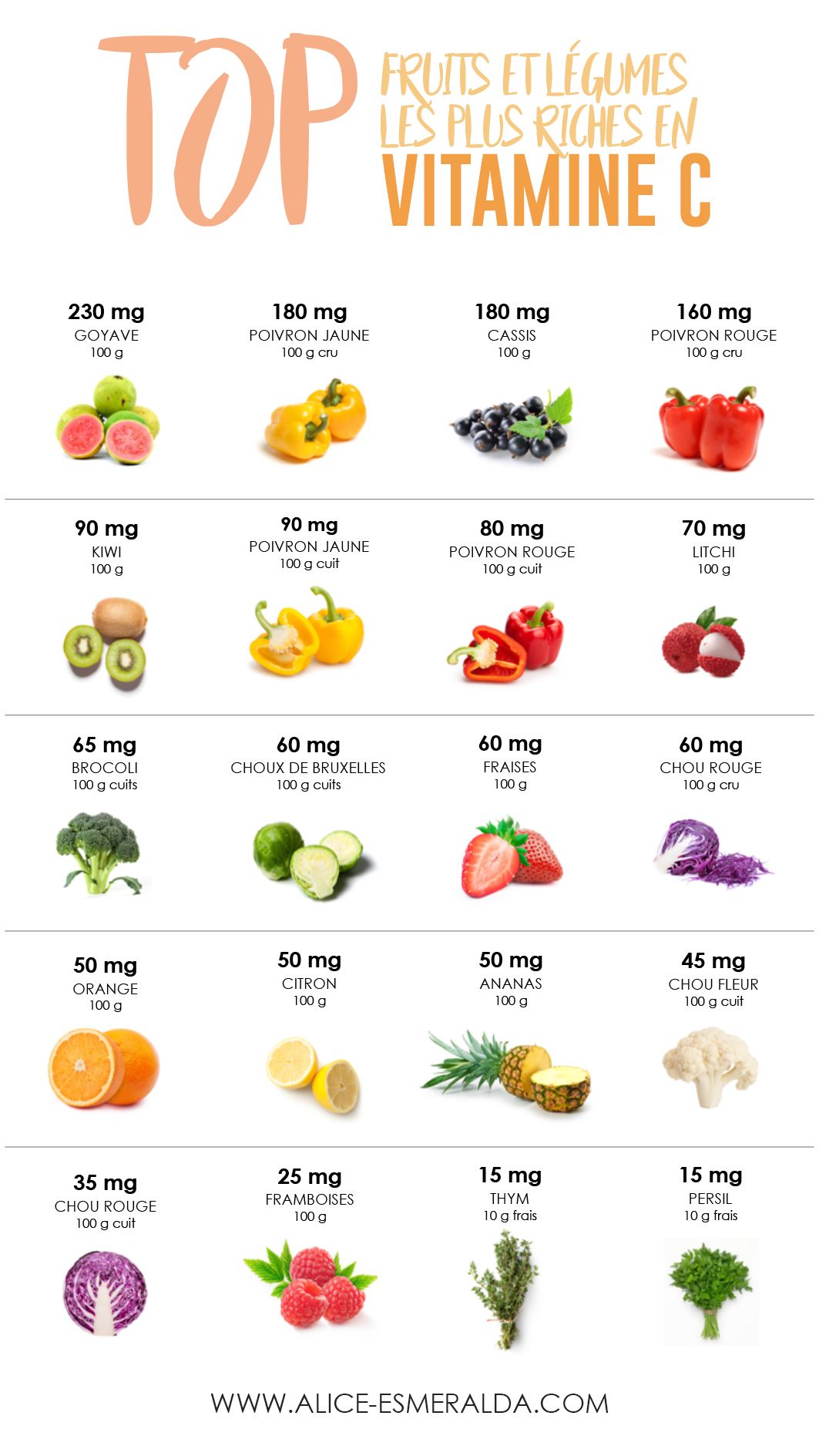 * Vitamine C: tous les fruits et les légumes! Particulièrement: Cassis, persil, poivrons crus, kiwi, litchis, fruits rouges, choux, agrumes, abricots, épinard, brocolis.