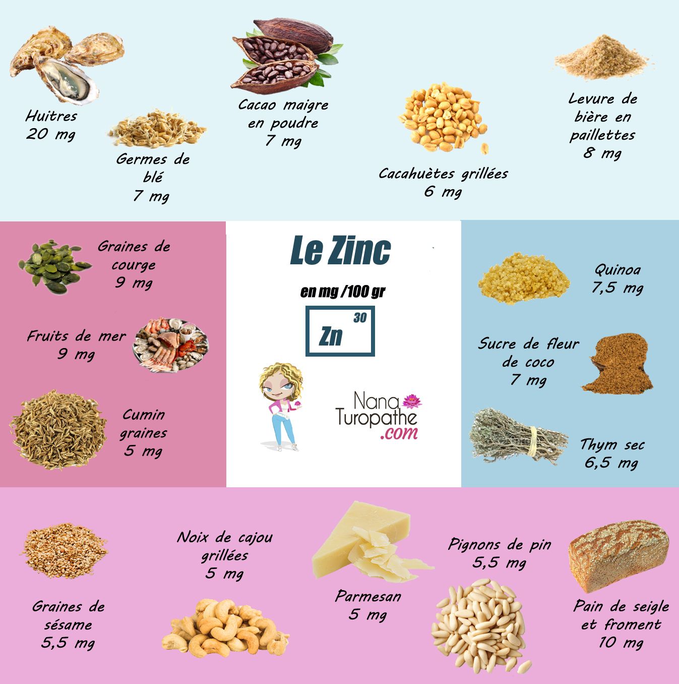 *Zinc: Huîtres, graines de courge, amande, lentilles (les faire tremper avant cuisson pour éliminer l’acide physique)